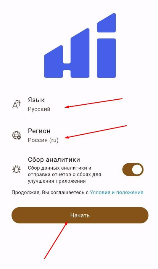 После запуска приложения вы можете выбрать язык интерфейса и регион.